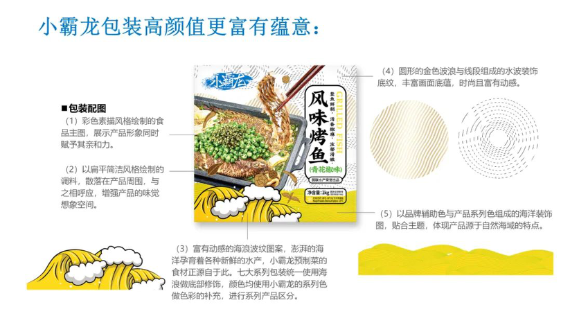 小霸龍升級后品牌定位為海鮮預(yù)制菜精選品牌,將聚焦預(yù)制菜產(chǎn)品,如風(fēng)味烤魚、調(diào)味小龍蝦、水晶蝦餃等,擁有7大系列預(yù)制菜。煥新品牌形象后,小霸龍用一個歡樂、鮮潮、充滿愛及生命力的形象面向新消費(fèi)群體,走入大都市人群的忙碌生活中,以“打造消費(fèi)者最親密的飯友”為品牌理念。